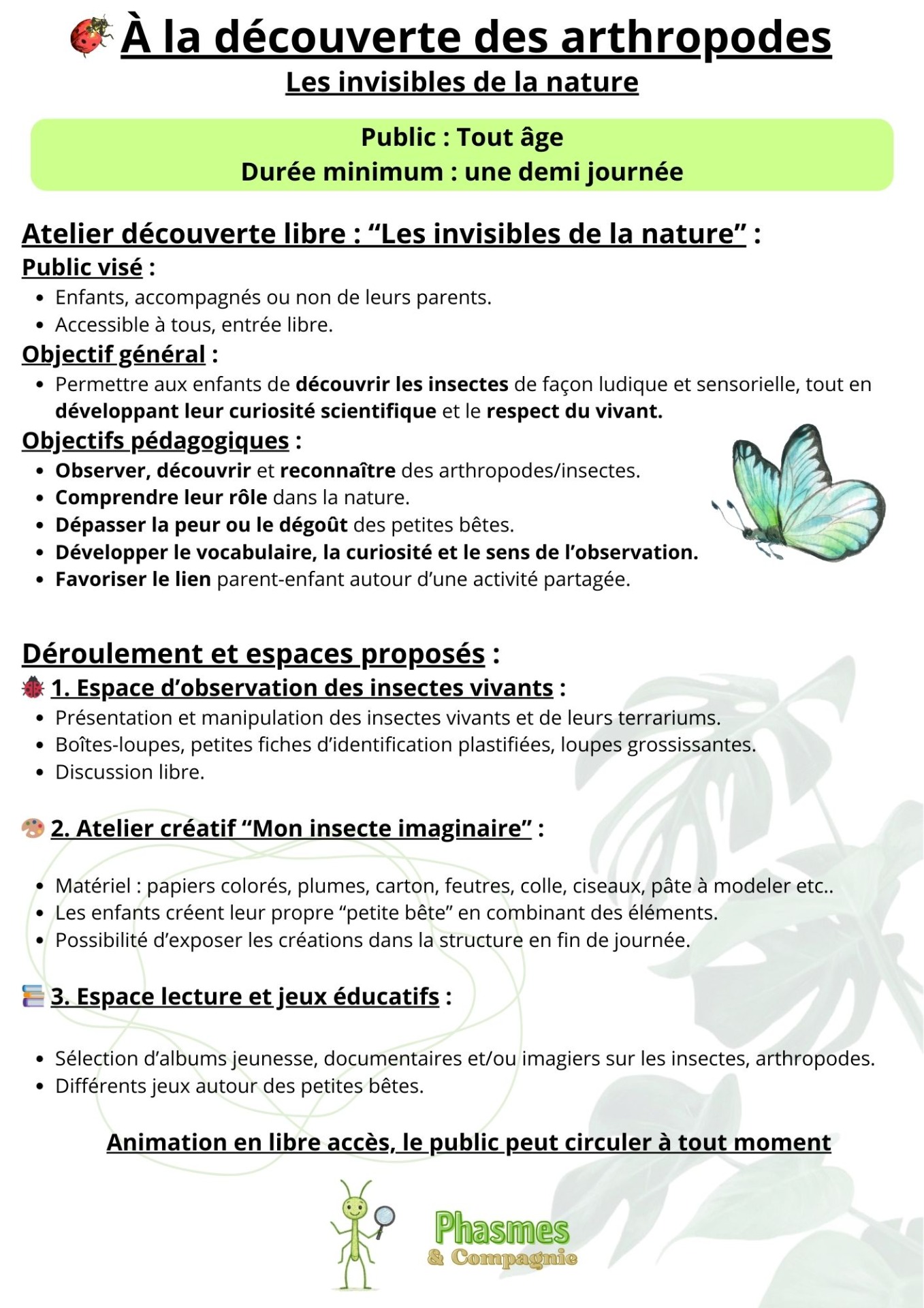 Au cours de ces moments de découverte, parents et enfants sont invités à observer de véritables arthropodes, à échanger, poser des questions et explorer ensemble le monde du minuscule dans un cadre accessible et convivial. L'approche privilégie la curiosité, le partage et la transmission, sans contrainte de format scolaire, afin de permettre à chacun de découvrir à son rythme.